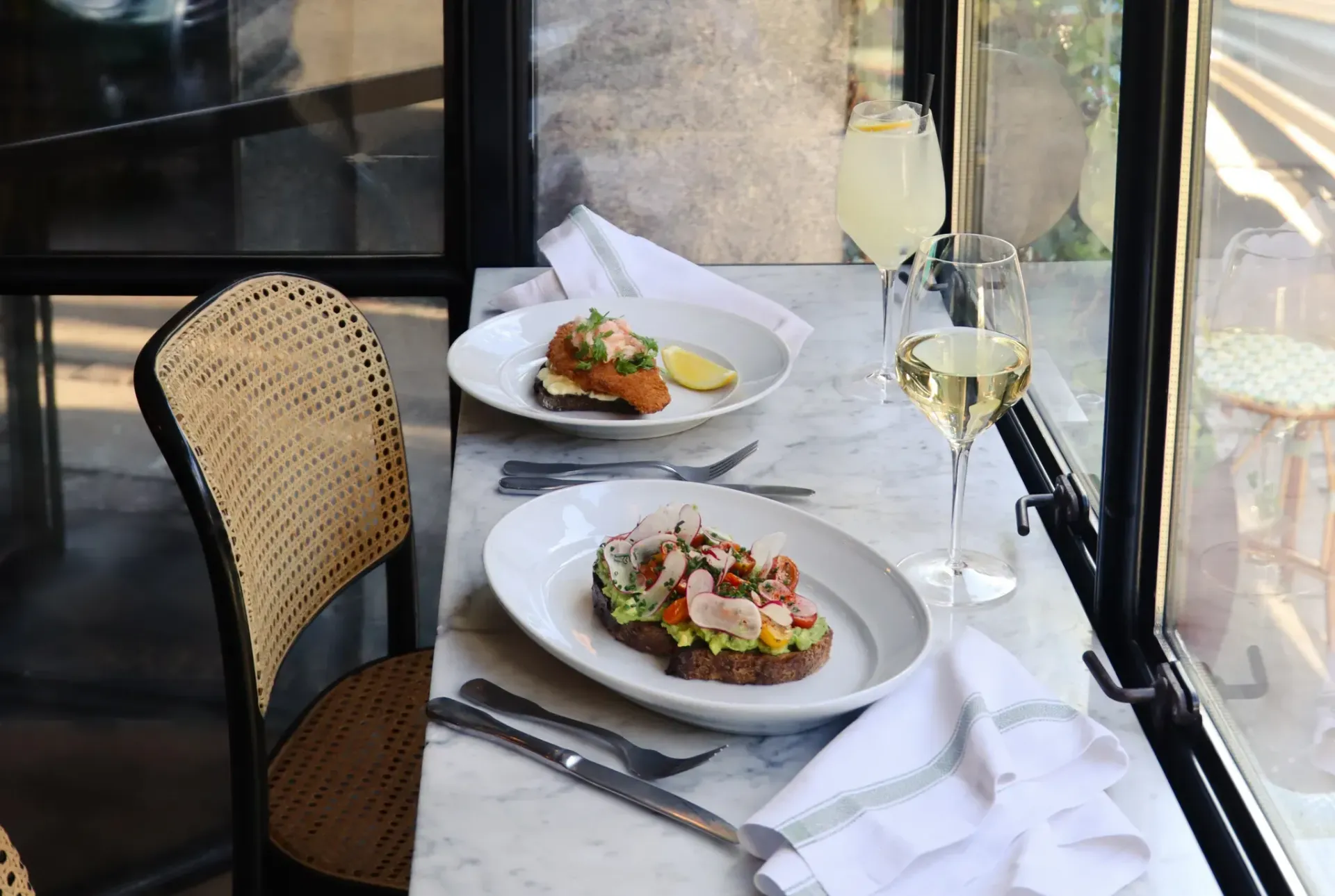 Fried plaice with hand-peeled shrimps and lemon mayonnaise Avocado on grilled sourdough bread with baked tomatoes, radish, and chives Beef tartare with green salad and pommes frites Caesar salad with romaine, radicchio, caesar dressing, sourdough croutons, grilled chicken, and parmesan cheese
