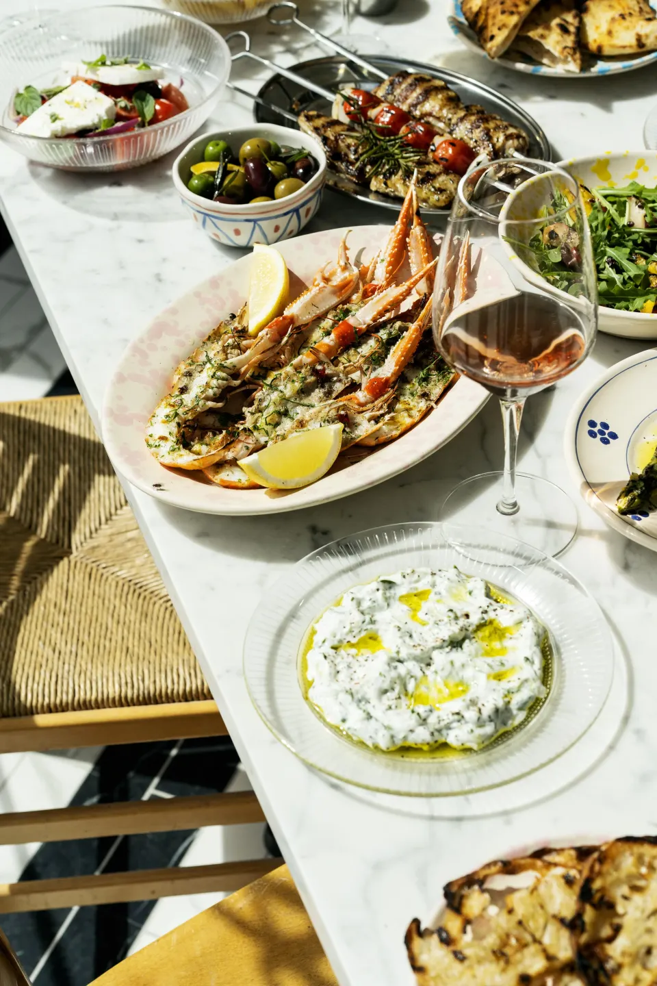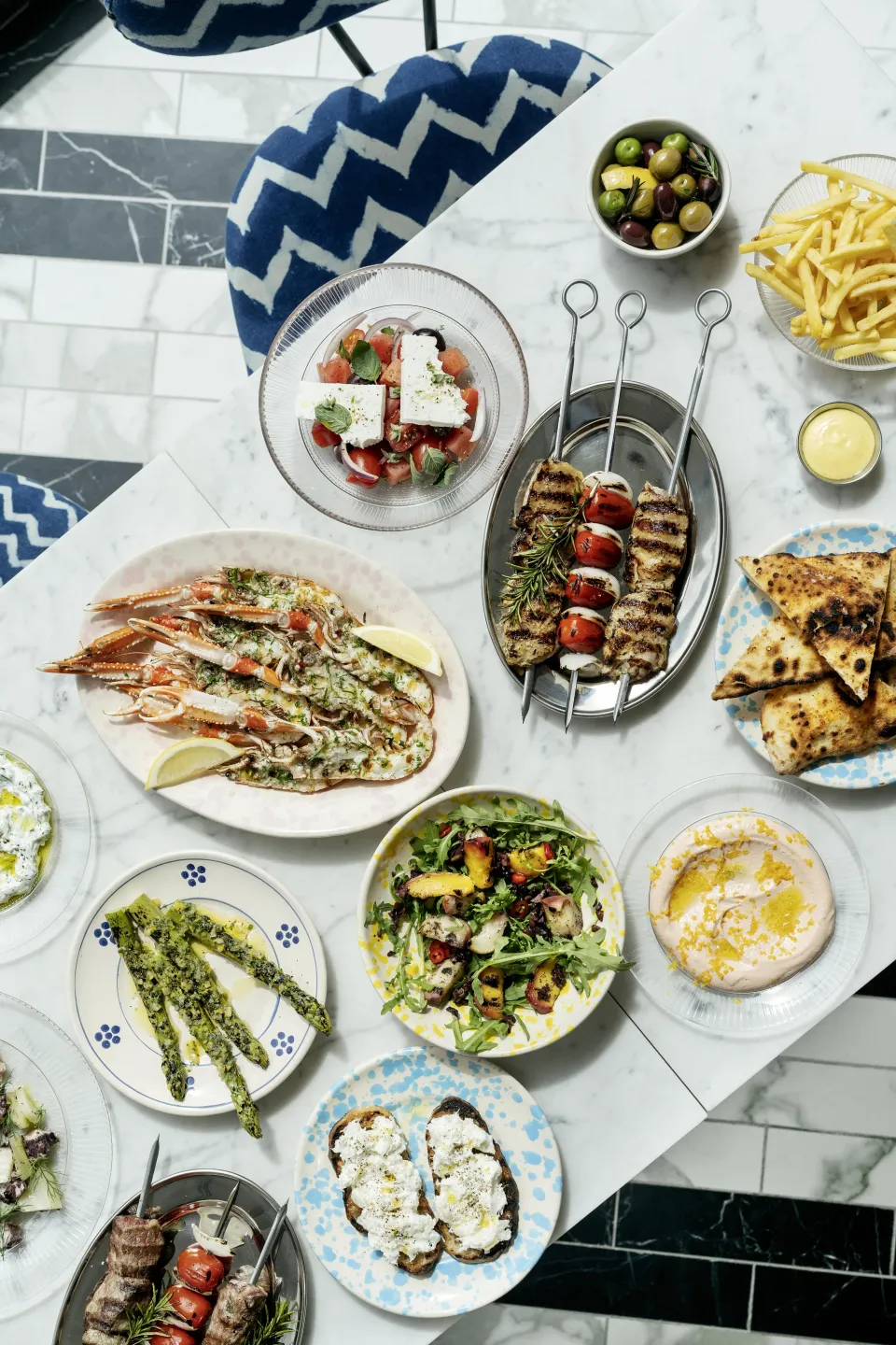 The extensive menu offers a varied selection of seafood, meats and green dishes. Whole fish and shellfish, skewers with meats and vegetables are prepared on the large Parilla grill. You will also find traditional servings from the Mediterranean as well as crudos and greens galore. From the large bar we serve cocktails and pitchers, ouzo, wines and cool beers. Yamas!