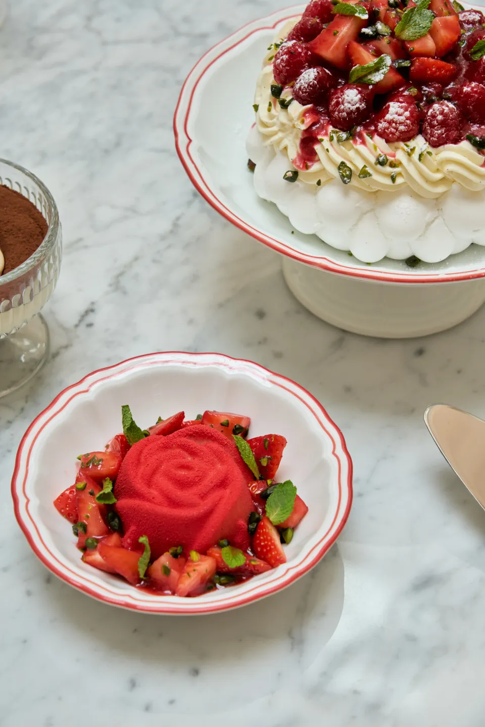 | Pavlova Pavlova with Berries, Vanilla Cream and Strawberry Sorbet | ||
