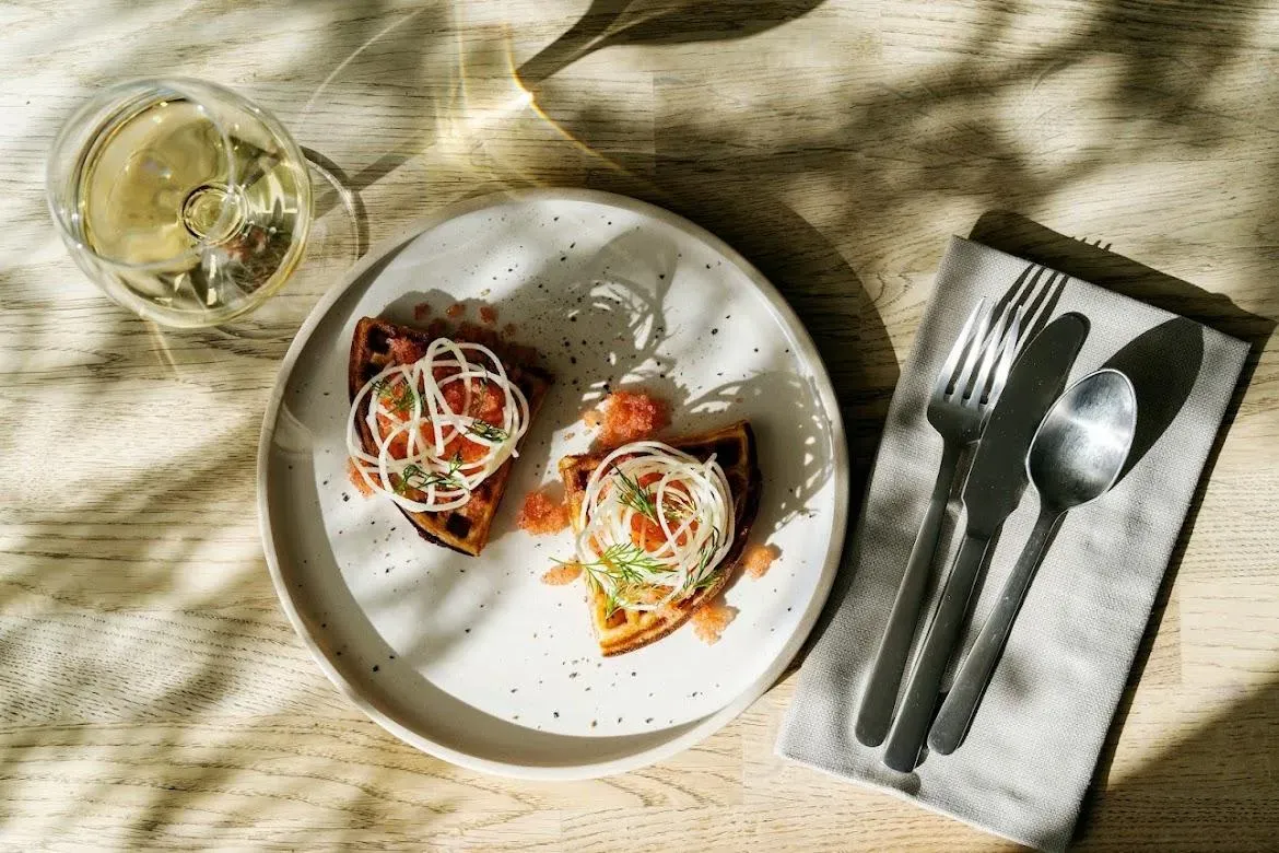 | Salted waffle with creme fraiche, chives and seaweed pearls | ||