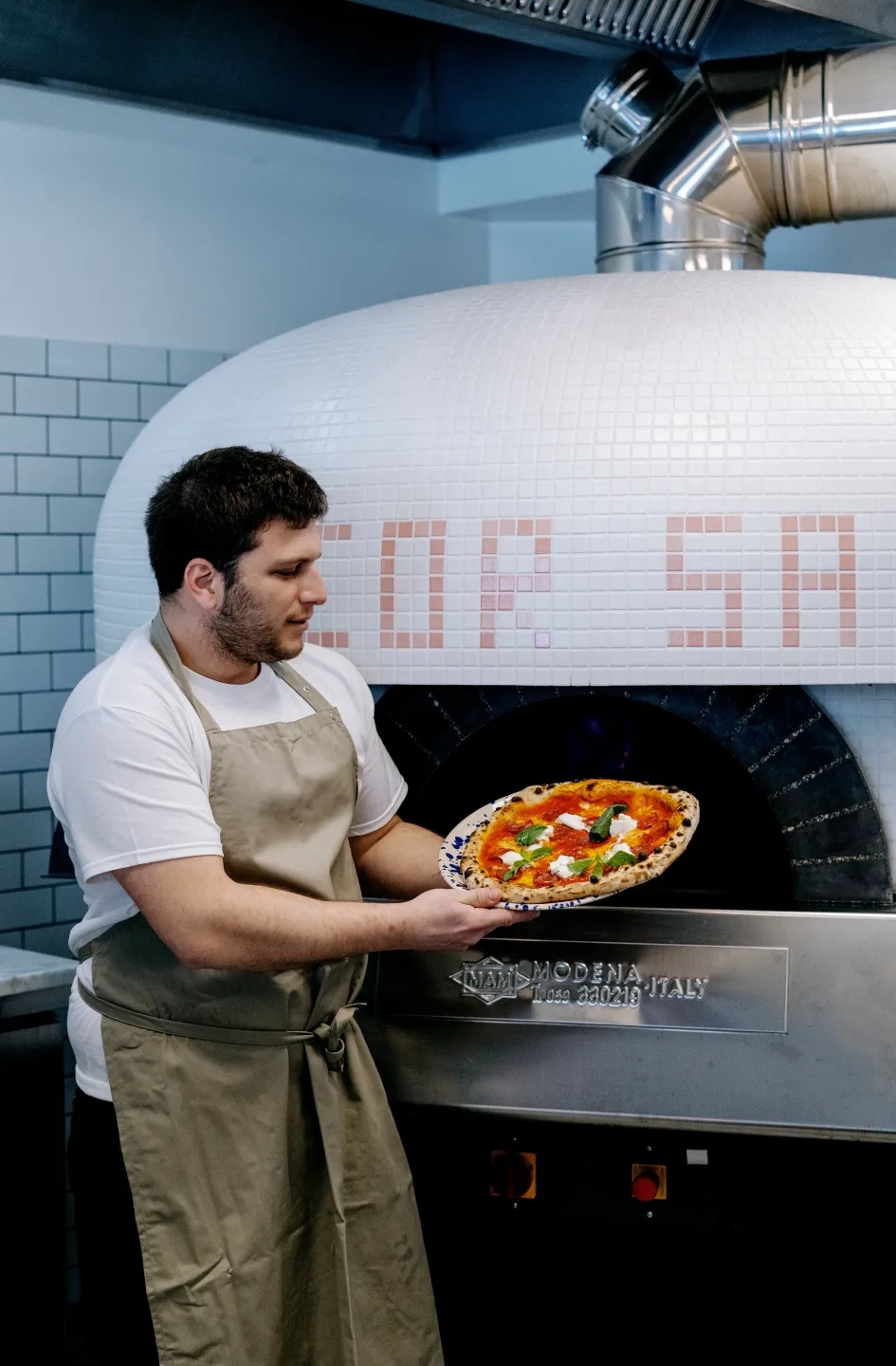 Den napolitanske pizza, er ikke som de andre. Pizzaerne bages eksplosivt ved høj temperatur i kort tid, så fyldet forbliver friskt og smagfuldt samtidig med at dejen får sine kendetegnende boblende leopardpletter. Vi bruger vores egen opskrift på surdej og lader dejen hæve i 4 døgn inden den bages, så den får den optimale smag og konsistens som en pizza napoletana skal have.