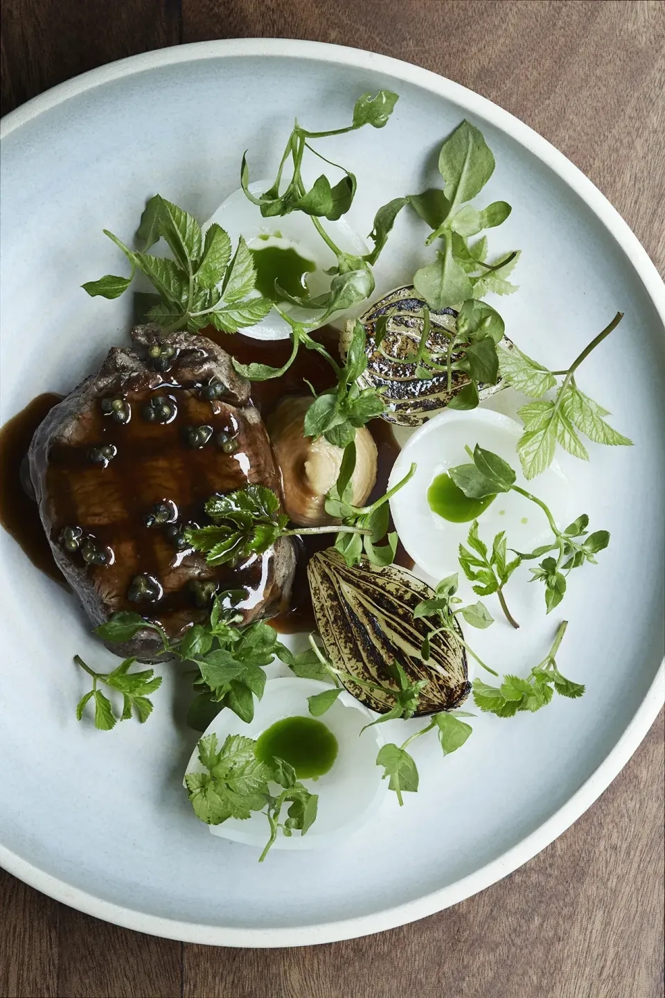 | Grillet Oksemørbrad med salatløg, bøgehatte & trøffel + 125,- | ||